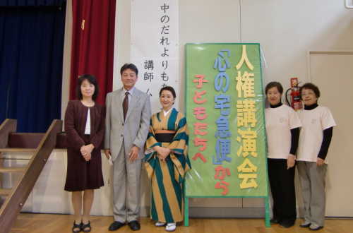 | 今回の講演発案者、古賀さんの小学校同期生という事で、一番先に心の宅急便の日程を入れてくださった柴田敏行校長先生。講演の看板も柴田先生の手作りです。全校生徒107名のアットホームな学校です。 講演後に 全校生徒が「ありがとうの花」を私たちのために大合唱してくれました。 思わず胸が一杯になって 涙がポロリ! |