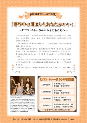 | 三泊四日、中学校三校&小学校五校の強行軍の旅でしたが 思い出を沢山頂きました。 北九州の子供達、会えて嬉しかったです。また 何処かで会おうね! 「我が社が地域に還元出来る物は何か?と考えた時、それは教育だと思いました」そうおっしゃって西日本新聞北九州本社の社の事業の一環として甲木さんの企画を受けて下さり心の宅急便を北九州に呼んで下さった玉井行人代表、半年も前から各校の校長先生と何度も打ち合わせを重ね、豆紙人形やハープの運搬、人形展示を最後までお手伝いくださった甲木さん、宮崎さん、松永さん、素敵な記事を書いてくださった大庭さん、そして見えない所で色々お手伝いくださった西日本新聞北九州本社の方々、ありがとうございました。 心からお礼を申し上げます。 ヒロコ・ムトー&心の宅急便メンバー |