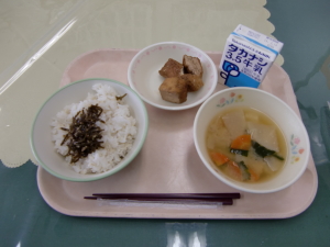 | 今日は和食メニュー。しゃけと野菜がたっぷり入ったお味噌汁。切り昆布のふりかけが美味しいご飯。味がしっかり浸みた厚揚げ。そして牛乳!美味しくいただきました! | ![]() 今日の給食 |