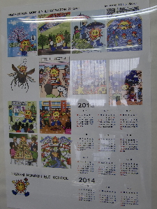 東本郷小学校には「ひがほん」と言うとっても可愛いキャラクターがあります。全校生徒がすぐに描けるほど愛され親しまれています。行事などに登場する着ぐるみもあるとか。この素敵なカレンダーは藤城守副校長先生のイラストです。 |