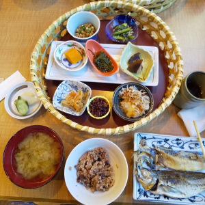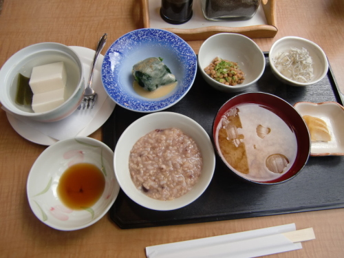 | 玄米粥、湯豆腐、納豆、シラス大根、 ほうれん草の白和え、なめこ味噌汁 お新香 |