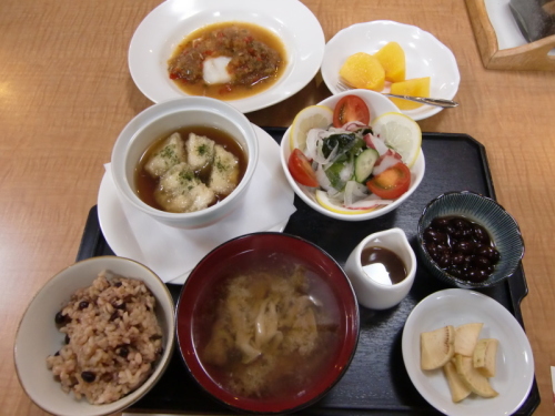 | 玄米粥、湯豆腐、納豆、シラス大根、 ほうれん草の白和え、なめこ味噌汁 お新香 | 小豆入り玄米ご飯、白菜と玉ねぎの味噌汁、鮭のトマト煮、大根のあんかけ、 蟹とトマトとキューリのサラダ、黒豆、 お新香、デザートの柿 | ||