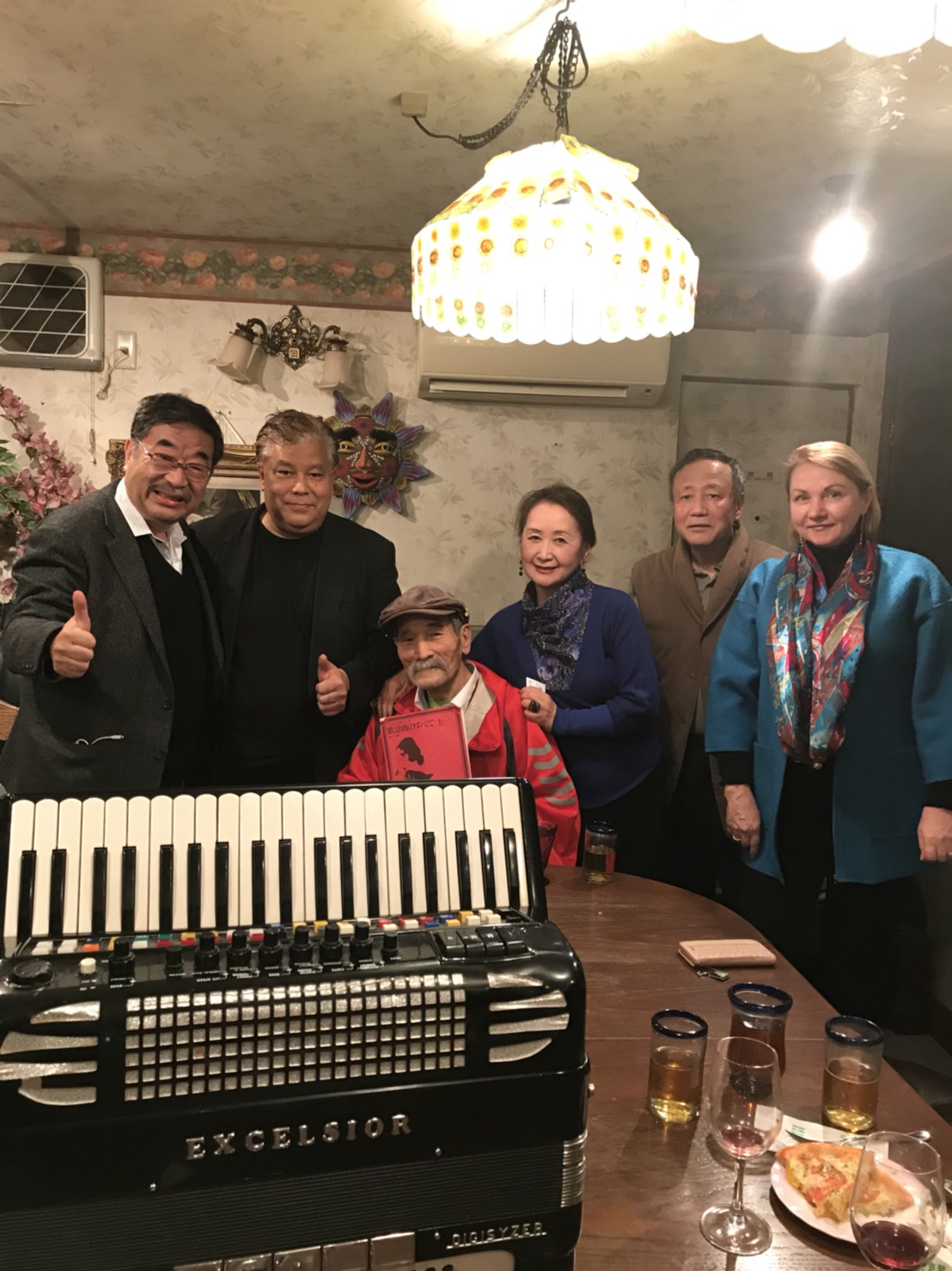 | メキシカンレストランで クリスマスパーテイ 石原先生ご夫妻と先生のご友人たち。 世界中を駆け回る実業家、中村繁夫氏と セバスチャン、ゴメスさんとチャーリー石黒さん。 チャーリーさんのアコーデイオンとゴメスさんのピアノに感動しました |
