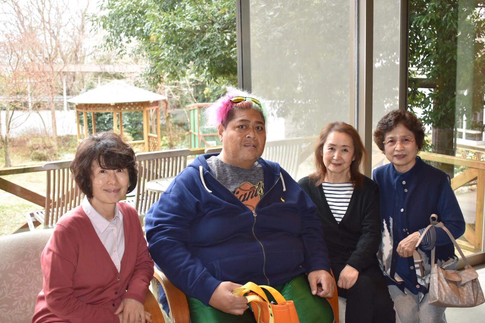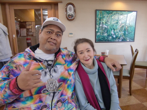 新館ロビーで小錦さんと 滞在中の小錦さんはみんなの人気者! 明るくて気さくで楽しくて、いつも誰かに囲まれていました。 |