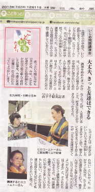 | 4月11日(土)、シアトルの紀伊國屋にて「天使になったシュクちゃん」の 朗読サイン会をしました。シアトルは2003年に公立高校2校、日系老人ホーム2箇所、 教会1箇所で母の豆紙人形を訪問展示をし、2010年にイングルモア高校、J・スタンフォード小学校で「心の宅急便」の朗読講演をしに行った懐かしい街です。 今回は5年前、私たちのためにハープを貸して下さり、素敵な紹介記事を書いて下さった ソイソースの越宮照代編集長と、紀伊國屋の渡邊成一店長がシアトルの人々にもこの本を 発信したいと企画し、お声をかけてくれました。 | |||