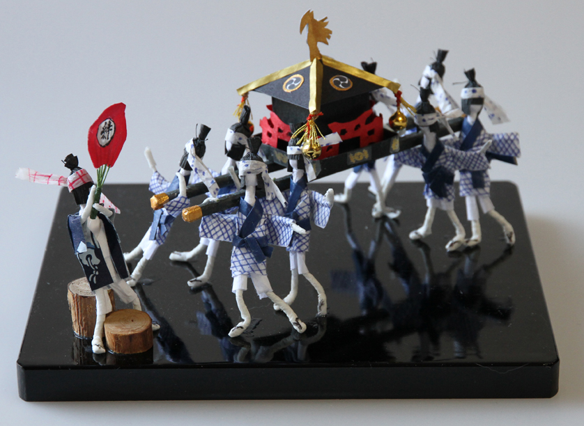 今日は盆の入りの日である。場所によっては7月にやる所もあるらしいが 主人が生きていた頃、いつも8月13日になると角地にある我が家の三角庭の 前でおがらを焚いて亡き人を迎えに行っていたから、私も昨年からそうしている。 仏事でも何でもよく知っていた主人は一昨年10月に帰らぬ人となった。 仏事だけでなく一般的な祭りごとなど世の中のしきたりに疎い私は、主人が いなくなってからはもう訊く人がいなくなったので、彼がしていたことを ひとつひとつ思い出してはご近所の物識りな方に伺いなおして確認をしている。 私が特に仏事に疎いのは、5年前に亡くなった母がクリスチャンで、家では 盆祭りなどをしていなかったからかもしれない。何でも生き字引のように知って いた母だったが、仏壇の前に何かお供え物をしていた記憶が私にはない。 夏と言えば、幼い頃の懐かしい思い出と言ったら祭りである。盆踊りに行ったり お寺の境内で金魚すくいをやったり、祭りの神輿や着物を着た女の人が踊り ながら練り歩く姿に心を躍らせたり・・・ 豆紙人形作家だった母の作品に「日本の祭りシリーズ」がある。母の故郷下関の 八丁浜祭りや亀山神宮祭り、お上臈が男衆やかむろを従え練り歩く先帝祭り、 山形の紅花祭りなどである。それらの作品は2005年にパリ日本文化会館で 母の豆紙人形展を開催した際に、パリに寄付してきた作品で日本にはない。 私は今、日本にないそんな母の作品を写真を見ながら「真似紙人形」作りをして 再現しているが、一昨日、祭りシリーズの中の八丁浜「おしゃもじ祭り」を作ってみた。 この祭りは、人柱となって唐戸発展の礎となったお亀さんの功績を称え、約1000人の 踊り手がしゃもじを持って「八丁浜えらいやっちゃ!」と掛け声をかけて踊るそうだ。 母の作品でしか見たことのない遠い九州の地での祭りだが、被災地の方を励まし 少しでも元気になっていただくよう、祈りをこめて作ってみた。 |