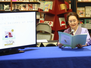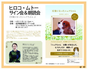 | 「天使になったシュクちゃん」が シアトルから「来てください」と お声がかかりました。4月11日、シアトル紀伊國屋店にて朗読サイン会が開催されます。「シアトルにも犬好きが沢山います。ペットを喪った悲しみに立ち上がれない人も。そんな人に明るい勇気をくれるこの本を シアトルのアメリカ人と日本人に届けたいと思います」と現地の紀伊國屋書店・渡邊店長と、日本人向けタウン紙「ソイソース紙」の編集長越宮さんの共同企画です。 お客様はアメリカ人と日本人、半々なので、朗読は日本語版と英語版両方やることになりました。英語版は学生時代からの親友、ショルツ悦子さんが朗読してくれます。 | クリックすると大きくなります |