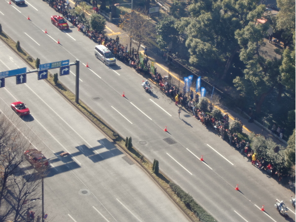 | 2016年1月3日、今年は毎年帝国ホテルの17階アクアラウンジにテーブルを予約している友人の佐藤一家にお声をかけられて、私もランチをしながら箱根駅伝を観戦。 見えますか?この豆粒のような小さな姿が渡辺君です。2位に7分以上引き離した堂々の1位!!シャッターを押し、夢中で二枚目を連写した時は、もうパトカーしか写っていませんでした。速い!!青学は今年10区全て1位通過。39年ぶりの偉業だとか。 来年もここで三連覇を見届けるぞー!! | |||