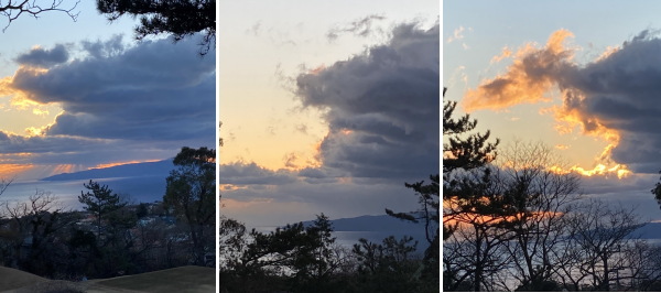 今年の初日の出は6時50分。6時15分サナトリウム玄関で全員集合!日の出スポットに向かった。風もなくぽかぽか温暖で快晴!素晴らしい初日の出日和! だがなんと日の出方向に大きな黒雲がどんより重く立ち込め、ご来光のお姿を拝めそうもない!がっかりしたのも束の間、黒雲の裏側から昇ったお日様は空を茜色に染め、姿は隠れたままながらも黒雲の縁を刻々と茜色に変えて行き、雲間から燦燦と漏れ輝く陽光の荘厳な情景に私たちはただただ感動し眺めていた。 |