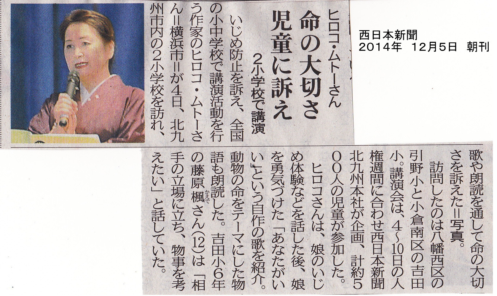 神奈川新聞に「世界と歩む神奈川っ子 いじめ、歌で克服